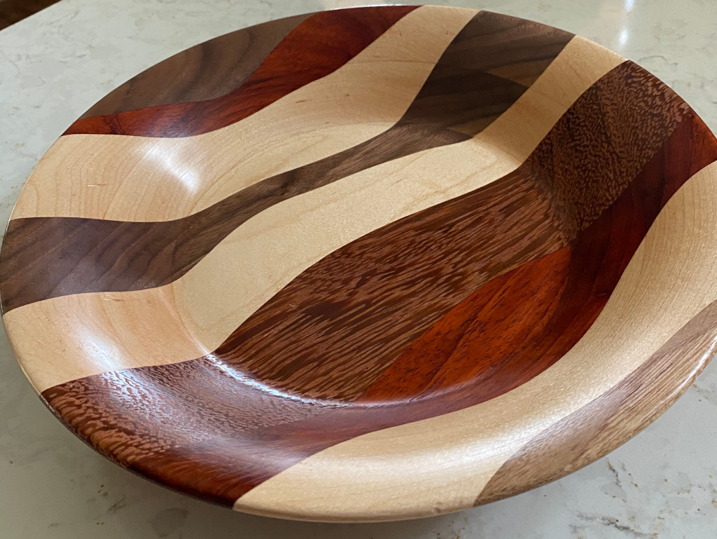 Three projects made from maple, yellow heart, purple heart, bloodwood and wenge Bowl #1 Made from 2400 individual pieces. Bowl #2 Made from 1600 pieces. Plate