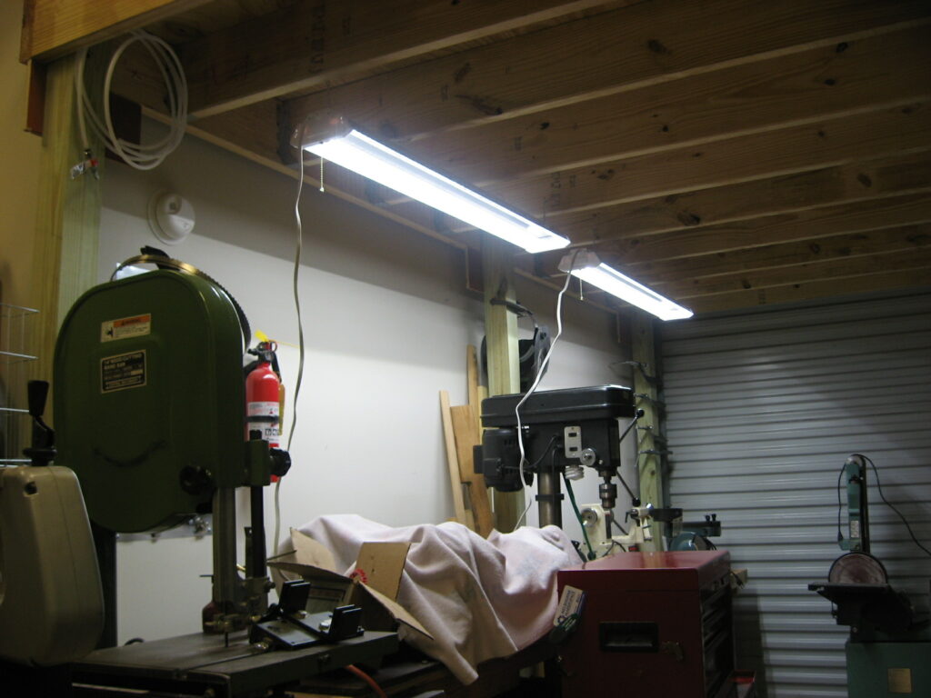 We purchased some LED shop lights for the machines area under the loft. That brings us up to four (4) shop lights for under the loft. We selected the LED ship light because they are brighter than the fluorescents and they should last longer. Cutting the cost of ownership. Jack was nice enough to mount them. They work great.