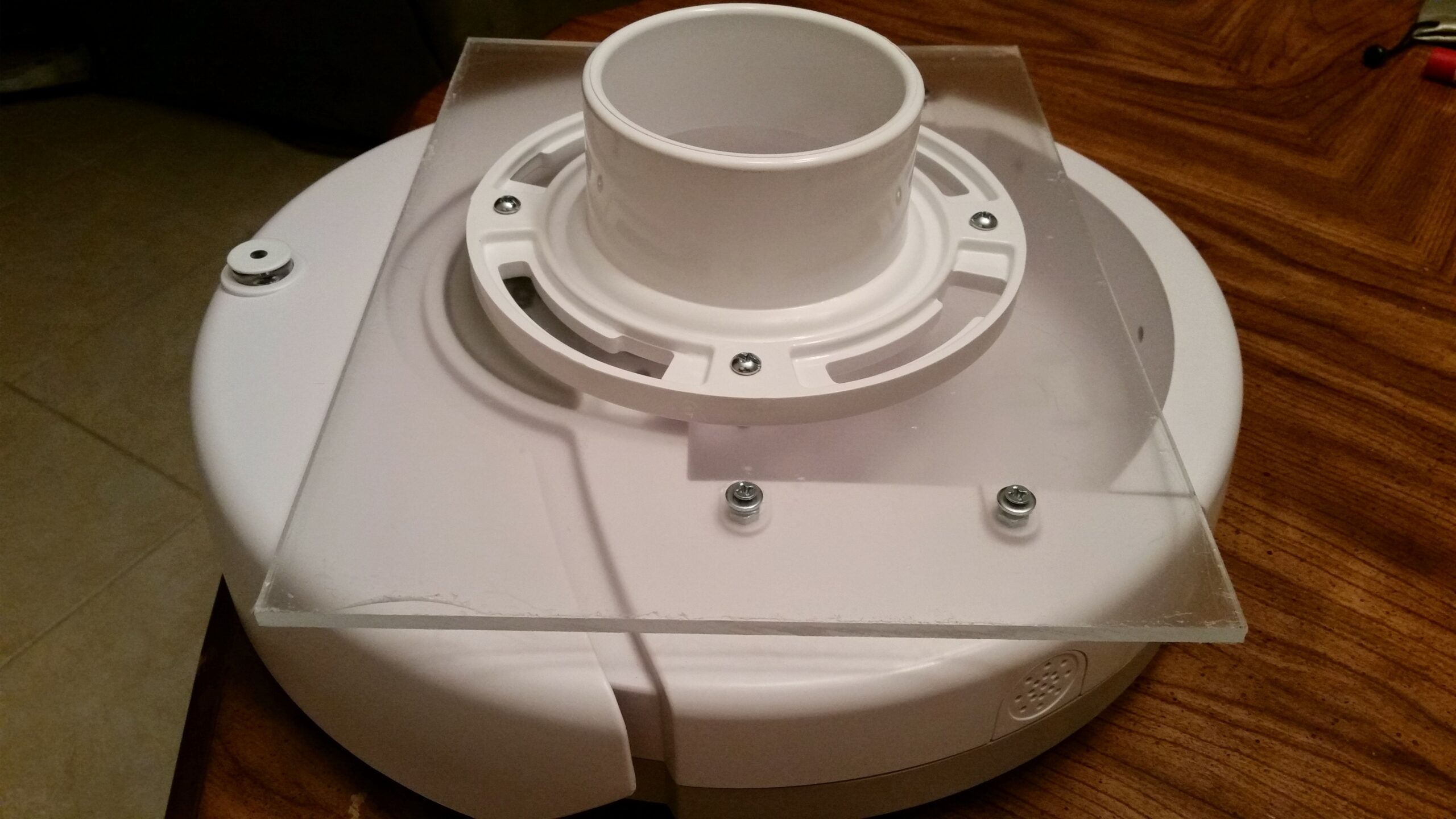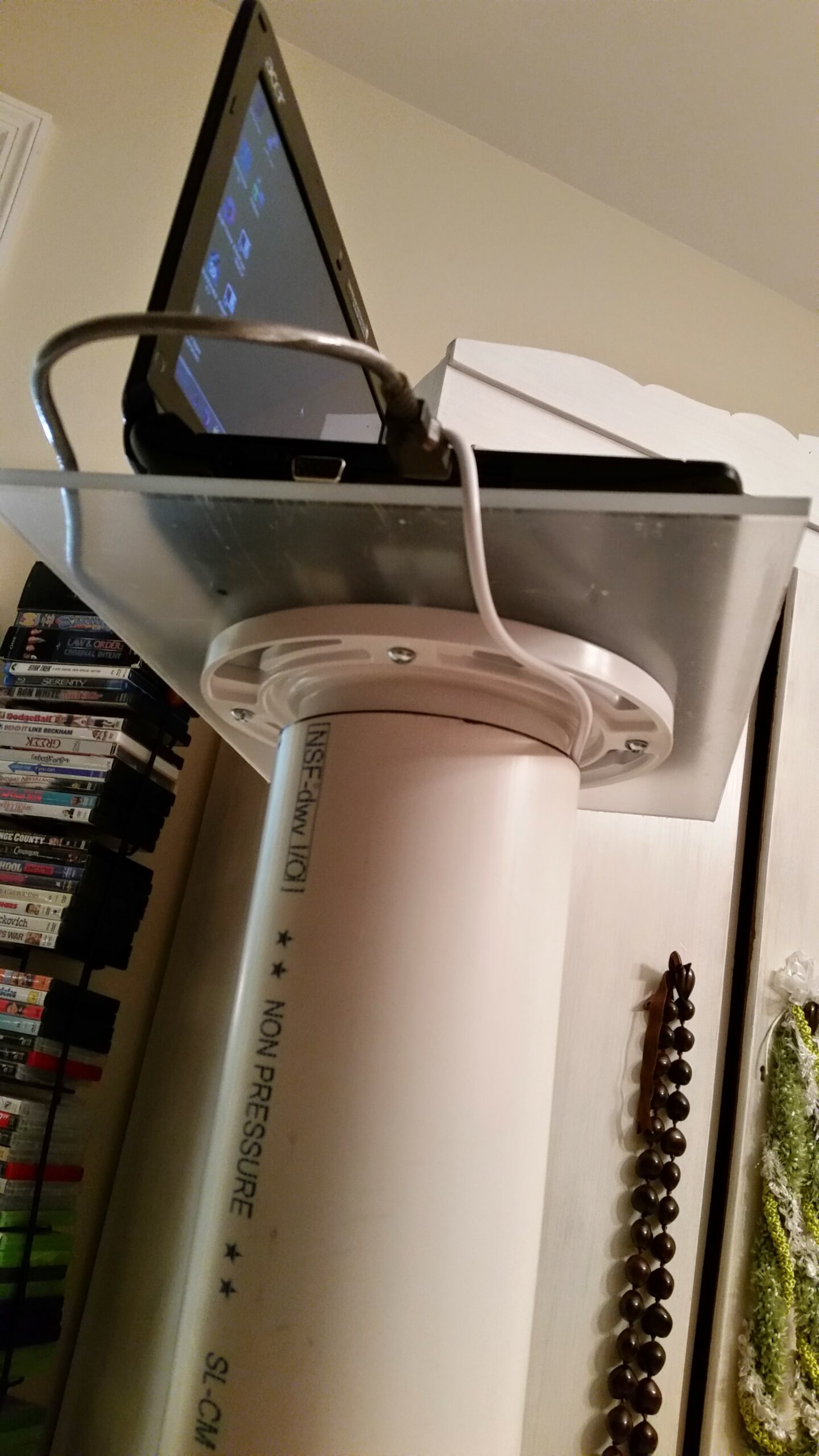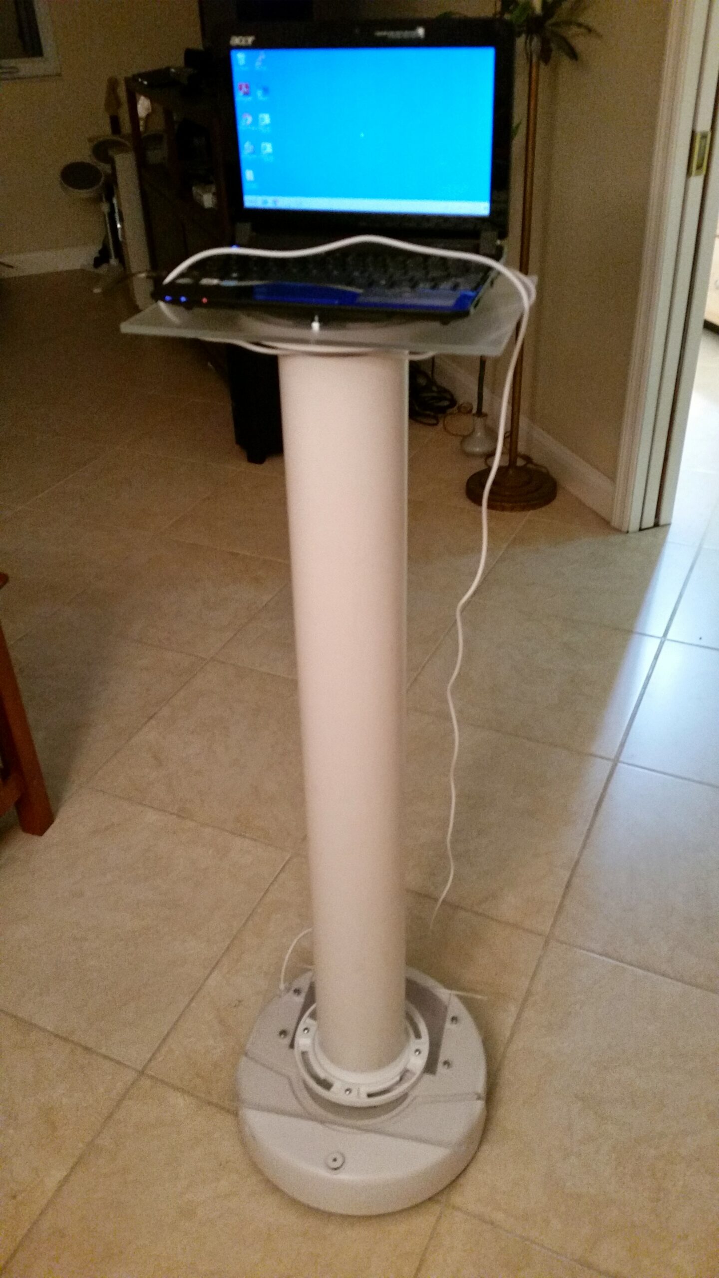 Now the telepresence robot has an actual support mast for the netbook it uses as the control server and video chat interface. This is much better than the stack of shoe boxes I was using temporarily. For now it is just a four inch PVC pipe with 4 inch flange on both sides screwed into a sheet of quarter inch thick clear acrylic. The flanges fit so snugly that there was no reason to glue them in. This makes it easy to take apart and put back together for delivery to your remote location. The bottom sheet is screwed into the mounting holes built into the iRobot Create. By adding the optional fourth wheel that comes with the Create it actually makes this very stable. The robot and its battery are quite heavier than the laptop and pipe so even with sudden, jerky movement it only wobbles a bit but doesn’t fall down. I’m sure the second you try to go up a slope or ramp it will absolutely fall over. The next upgrade will be to integrate the video chat directly into the control software. As of now you have to have someone in the room with the robot to start up the control software then start up a video chat with Skype or Google Hangouts, etc. Then from the remote computer you would also start up the control software, connect to the robot remotely, then join the same video chat. Then you have to have the control software on top but just moved over out of the way so it can respond to the W, A, S, D keys to drive it around while you chat or just look around. By putting the video chat directly into the control software it will be easier to control remotely without anyone having to be in the room. The next upgrade will be to make a web interface for the remote user to show both the video chat and controls directly in a browser window. As of now, the control software is written in C# so it requires Windows .Net or Mono to run it.