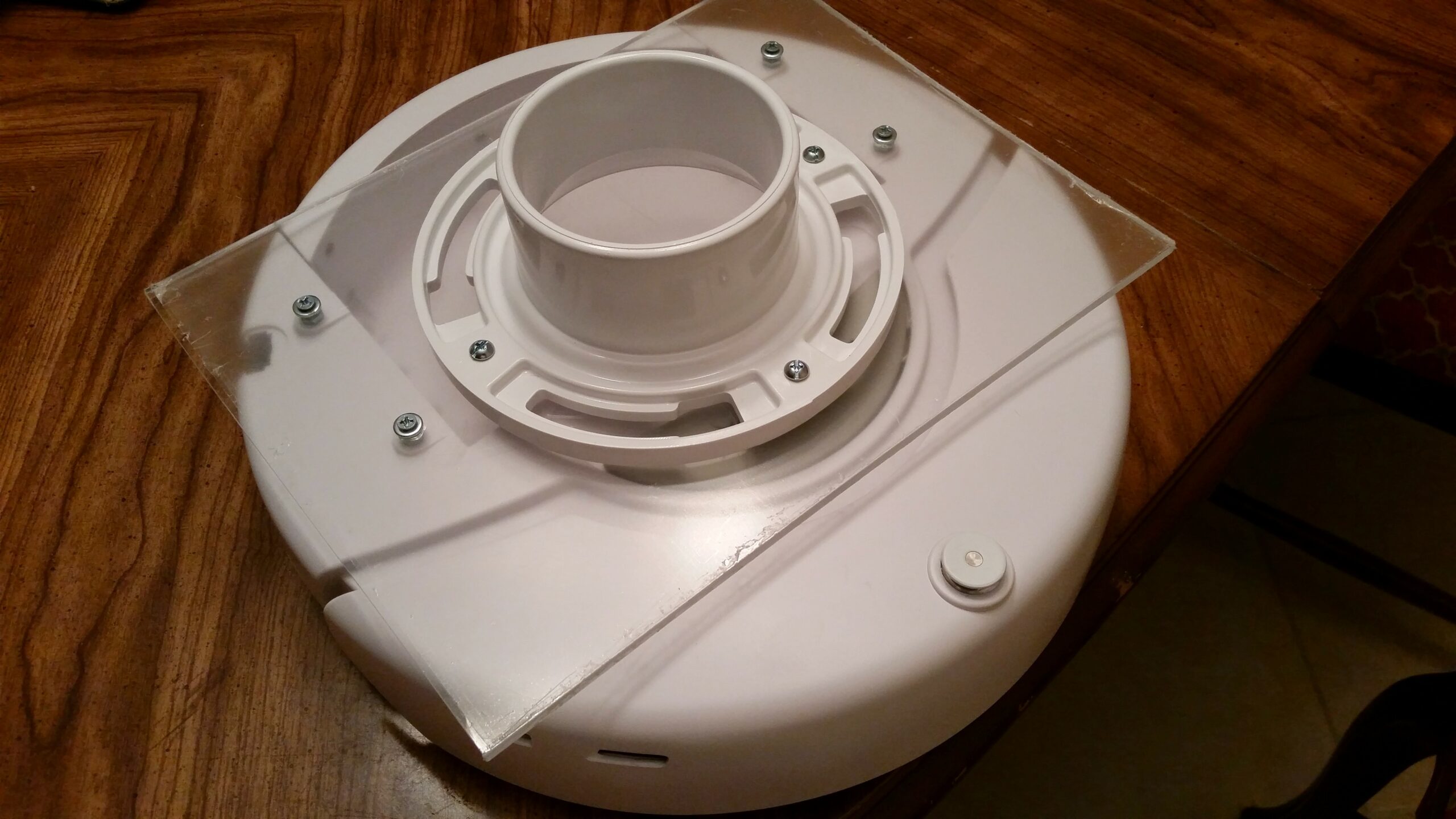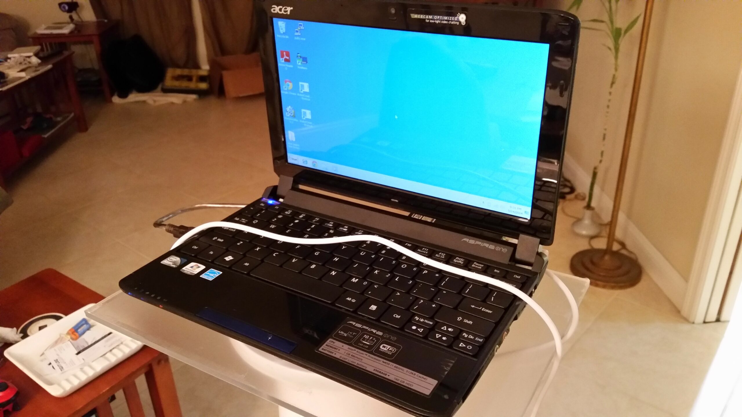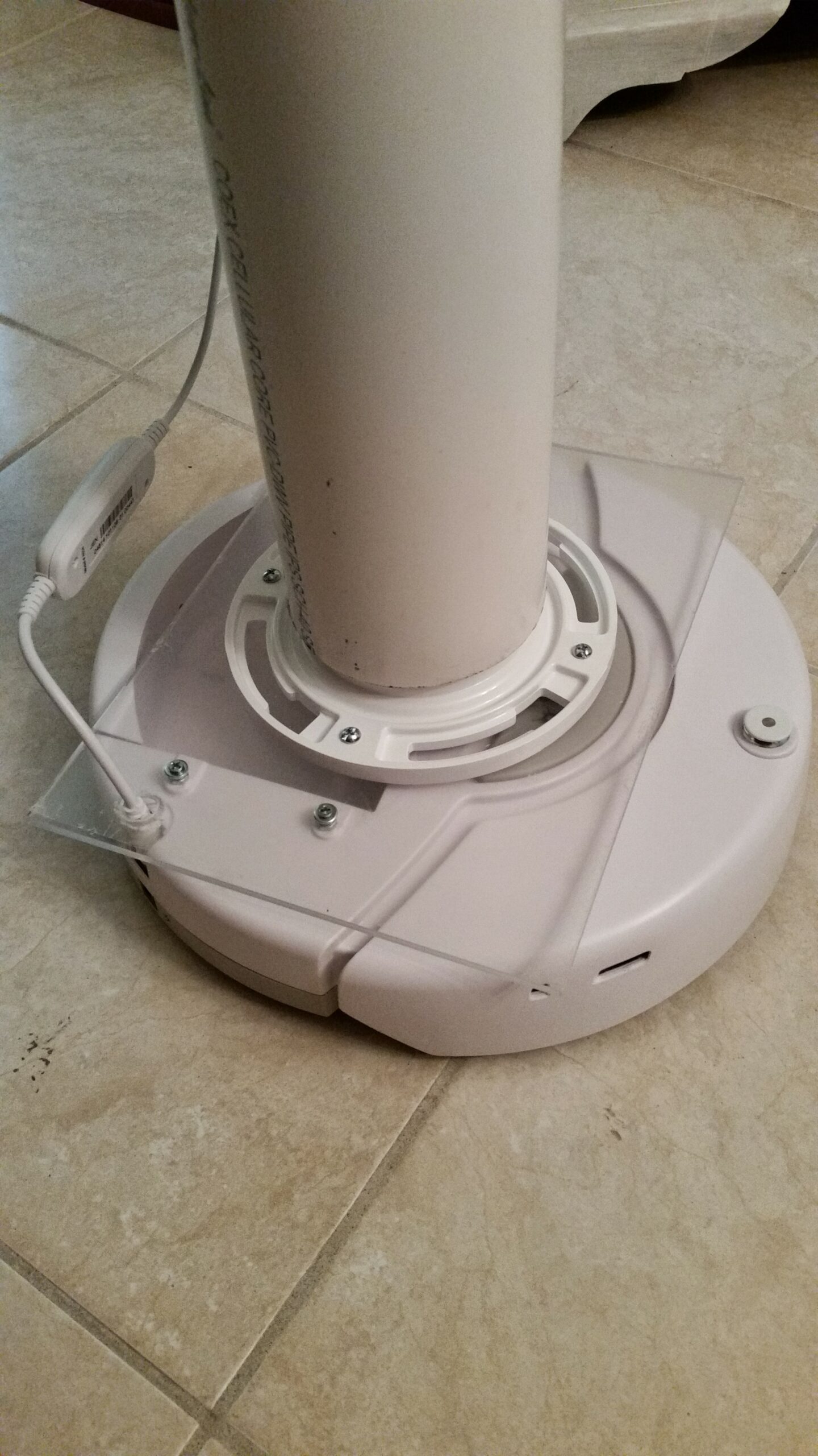 Now the telepresence robot has an actual support mast for the netbook it uses as the control server and video chat interface. This is much better than the stack of shoe boxes I was using temporarily. For now it is just a four inch PVC pipe with 4 inch flange on both sides screwed into a sheet of quarter inch thick clear acrylic. The flanges fit so snugly that there was no reason to glue them in. This makes it easy to take apart and put back together for delivery to your remote location. The bottom sheet is screwed into the mounting holes built into the iRobot Create. By adding the optional fourth wheel that comes with the Create it actually makes this very stable. The robot and its battery are quite heavier than the laptop and pipe so even with sudden, jerky movement it only wobbles a bit but doesn’t fall down. I’m sure the second you try to go up a slope or ramp it will absolutely fall over. The next upgrade will be to integrate the video chat directly into the control software. As of now you have to have someone in the room with the robot to start up the control software then start up a video chat with Skype or Google Hangouts, etc. Then from the remote computer you would also start up the control software, connect to the robot remotely, then join the same video chat. Then you have to have the control software on top but just moved over out of the way so it can respond to the W, A, S, D keys to drive it around while you chat or just look around. By putting the video chat directly into the control software it will be easier to control remotely without anyone having to be in the room. The next upgrade will be to make a web interface for the remote user to show both the video chat and controls directly in a browser window. As of now, the control software is written in C# so it requires Windows .Net or Mono to run it.